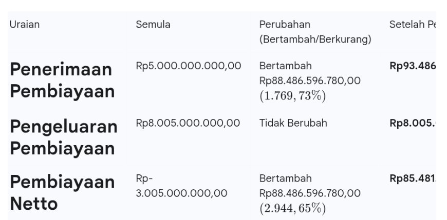 Sementara itu, pembiayaan daerah mengalami pergeseran cukup besar. Penerimaan pembiayaan naik Rp88,48 miliar, sehingga totalnya menjadi Rp93,48 miliar. Pengeluaran pembiayaan tetap pada angka Rp8,005 triliun, sehingga pembiayaan netto ikut meningkat.