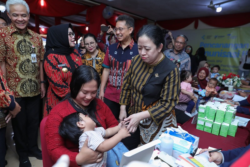 Ganjar yang turut mendampingi Puan terlihat sesekali menggendong Balita yang hendak diberikan imunisasi. Sebagai kepala daerah, ia juga memastikan akan mengawasi dan memberikan sosialisasi tentang program imunisasi polio dosis kedua.